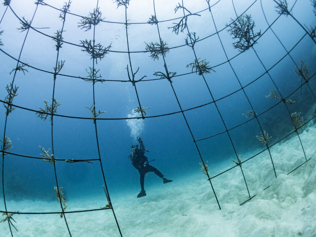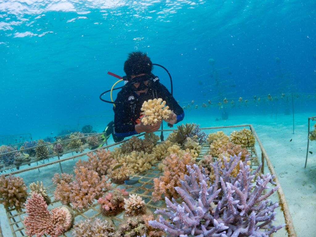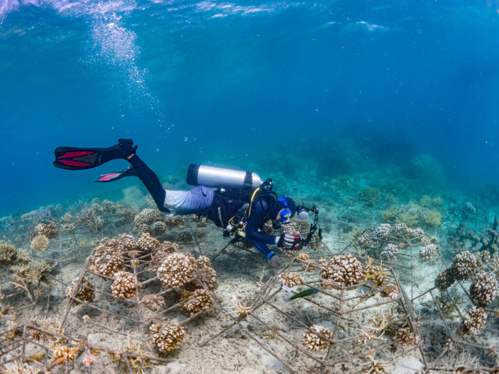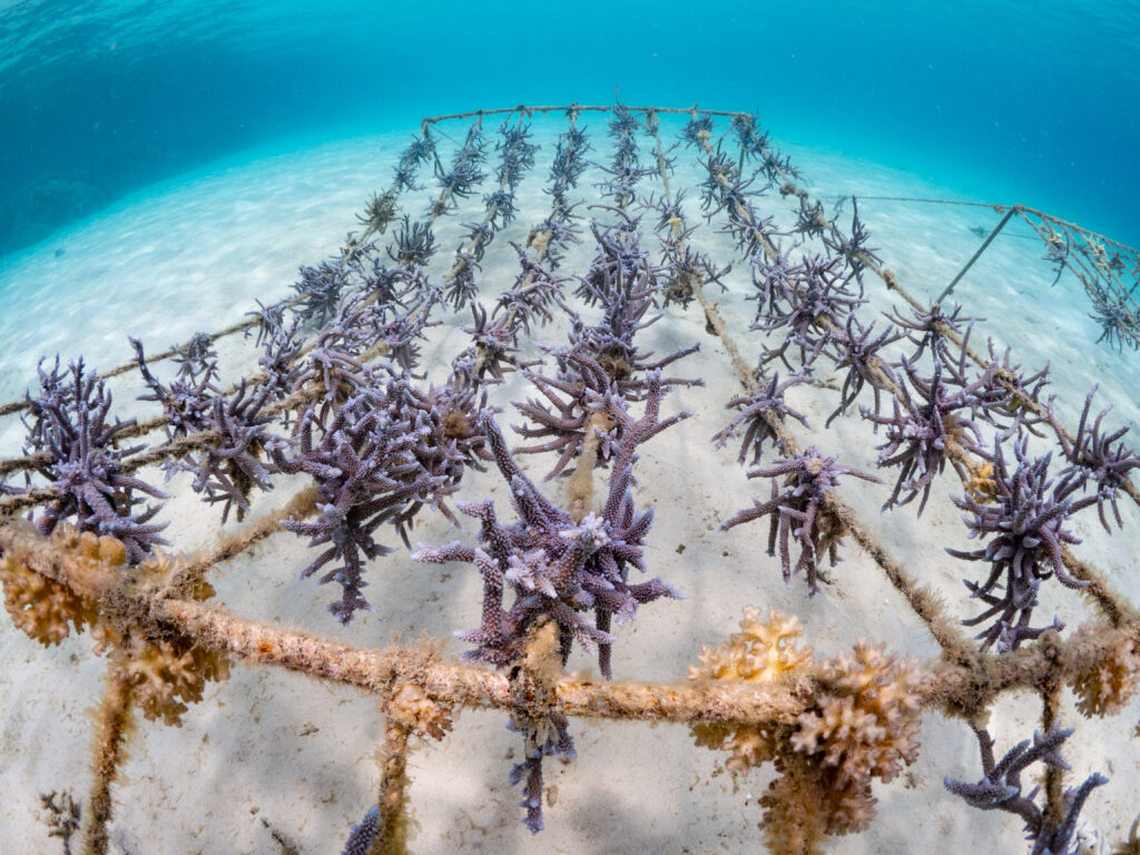 We created nursery sites for baby corals to grow quickly to a size where they can then be transplanted to areas of destroyed reefs.
